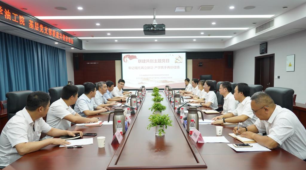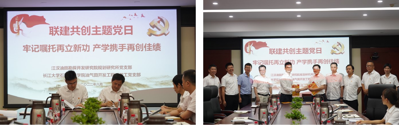 油气田开发系教工党支部与江汉油田勘探开发研究院规划研究所党支部联建共创启动会暨“牢记嘱托再立新功 产学携手再创佳绩”支部主题党日活动在江汉油田勘探开发研究院举行。研究院党委书记胡心玲、副院长荣焕青、院专家、联建支部党员代表,学院党委书记张光明、院长江厚顺、副院长李忠慧、联建支部党员代表等20余名同志参加,研究院规划研究所党支部书记康波主持。