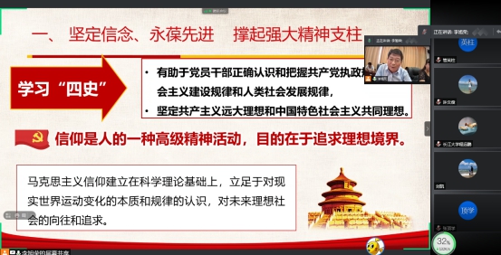 6月23日下午,学院在石油科技大楼B113室召开全院教职工大会,院长江厚顺以“学习‘四史’ 汲取智慧”为题为全院教职工了讲授了一堂形势与政策课,在外出差教师在腾讯会议平台线上同步学习。