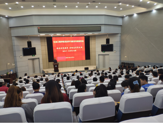 在武汉校区学术报告厅召开党史学习教育专题报告会,学院全体教职工和学生党员现场聆听报告,党委书记张光明主持报告会。