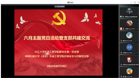 研究生第一党支部与中国石油大学(北京)井筒安全与控制党支部于腾讯会议召开六月主题党日活动暨支部共建交流。本次会议由王国庆同志主持,研究生第一党支部书记史永波老师、支部党员及井筒安全与控制党支部党员参会。