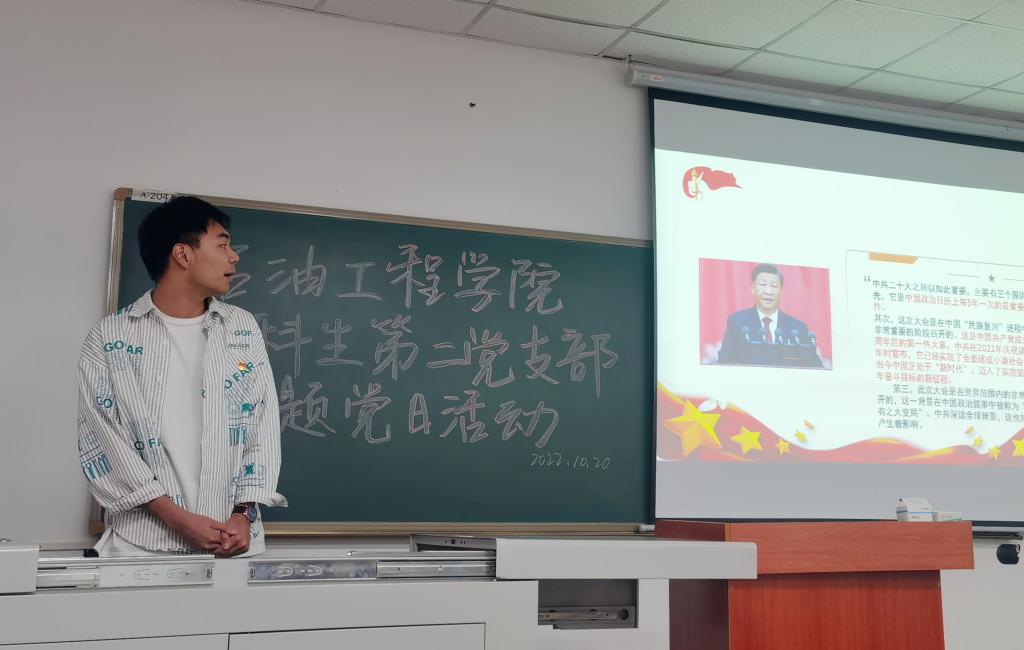 本科生第二党支部于A-204召开十月党日主题活动。本次会议由支部冯贯榆同志主持,支部31名本科生党员、党委副书记刘娥参会。