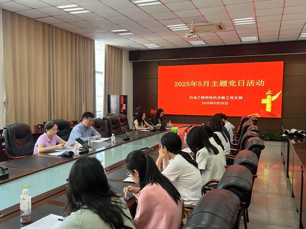 机关教工党支部于2025年5月29日14:30在石油科技大楼B113室召开五月主题党日活动。本次活动以“强担当 重实干 促融合”为主题,由党支部书记杨小玉同志主持,聚焦任务落实与问题破解,共谋学院发展新篇章。