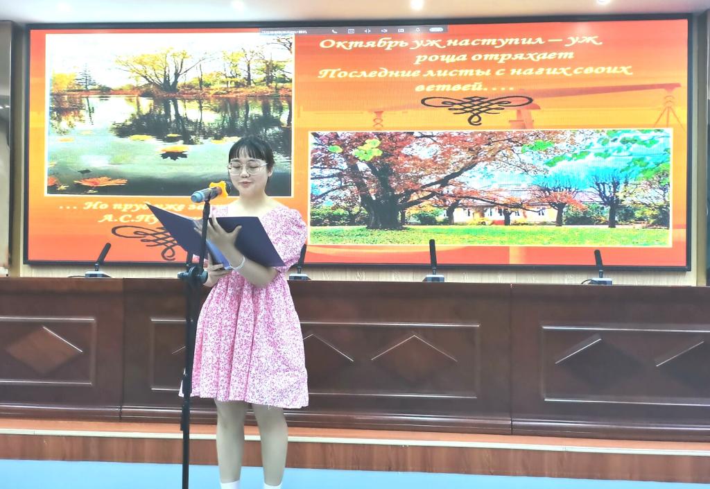 本次晚会用丰富精彩的诗歌和精致的画面给观众带来了一场视觉和听觉上的盛宴。“简朴和明朗”一直是普希金诗歌最突出的美学特征,《秋天》以简洁和独特的音韵美,表现了秋天是忧伤的,又是天高云淡的;这首诗也是像秋天样忧伤而明朗的。在二年级储运中俄班袁银兰同学深情的朗诵中拉下帷幕。