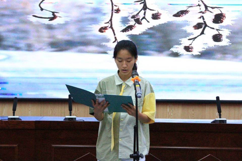 随后,油工中俄郝瀚翔同学朗诵了一首叶赛宁的诗歌《不惋惜,不呼唤,我也不啼哭》,为在场的同学带来了一场激情澎湃的朗诵。接下来,主持人通过幻灯片展示了不同时期的叶赛宁肖像,并播放了一段纪录片,展现了其在不同阶段的思想和追求,希望通过这个纪录片鼓励我们勇敢追求自己心中所想,勇敢追求幸福与爱情生活。