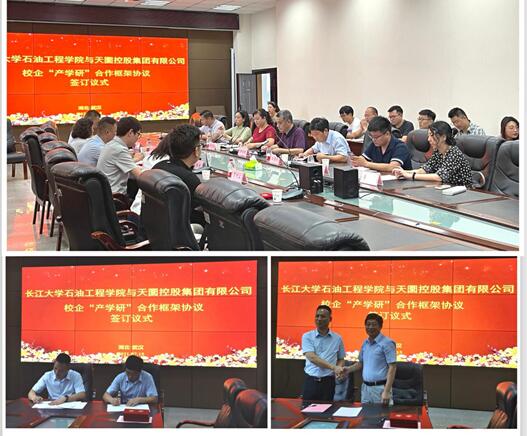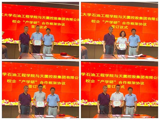高级人才培养实践、学科建设及科技合作提供有力支持,充分发挥校企双方各自优势,共同培养适应现代能源需求的高级专业技能人才和为国家在油气储运工程、石油工程、新能源及综合能源开发及应用方面提供技术服务。随后双方负责人代表签订了框架合作协议,并为天圜控股集团有限公司相关技术人员颁发了兼职导师聘书。学院党委书记张光明就贺总一行的到来表示了热烈欢迎,并就双方完成的签约仪式表示了祝贺,希望后期将框架协议约定内容落到实处,实现合作共赢。