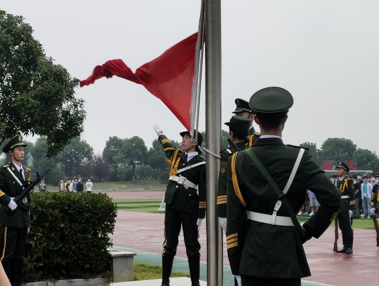 7时整,国旗护卫队踏着坚毅的正步,缓缓将国旗送入会场中央。他们坚定有力的目光、整齐一致的步伐,展现出了长大学子的风貌。在嘹亮的国歌声中,鲜艳的五星红旗冉冉升起,全体人员行注目礼。