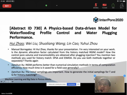 赵辉教授受邀参加会议并担任大会分会场主持人。会上,赵辉教授发表题为“A Physics-based Data-driven Model for Waterflooding Profile Control and Water Plugging Performance”的大会报告,引发与会专家的热烈讨论与好评。近年来,赵辉教授团队的研究成果在智能油气藏领域的影响日益深入,受到了国际同行的高度关注与认可。本届大会上,挪威SINTEF公司Manuel Borregales等人的大会报告中将其创立的数据驱动模拟模型(INSIM)引入到目前世界石油领域著名的开源油藏数值模拟仿真软件MATLAB Reservoir Simulation Toolbox(MRST)中,该软件被国内外广大石油高校和石油公司广泛采用,用于教学、科研和快速原型开发研究。