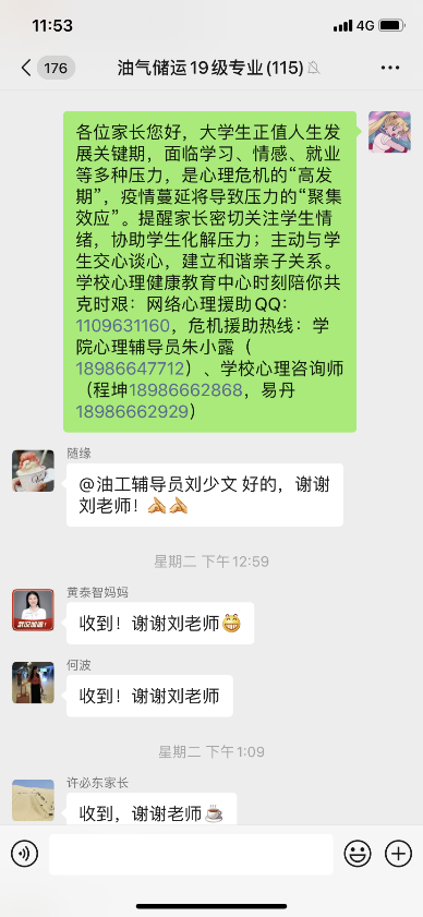致家长的一封信》,再次提醒家长坚定服从政府在疫情期间的防疫政策,在未得官方通知前,学生不得返校,提醒家长在居家期间要培养良好亲子关系,关注学生身心健康,主动和学生谈心交心,科学理解学生心理情绪,并公开告知家长各年级辅导员联系方式一起学校心理健康教育中心求助方式。学院通过辅导猫以及班级QQ群等形式,对学生开展了心理健康教育工作,鼓励学生科学求助,助力学生在疫情期间化解压力。