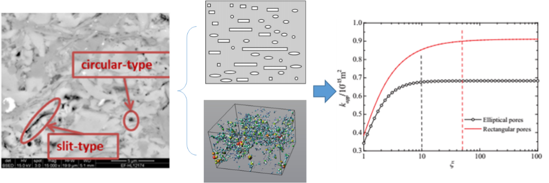 页岩储层多孔介质具体强非均质性,其孔隙几何形状对流体运移产生较大影响。通常,页岩孔隙几何形状包括从圆形到狭缝的各种可能形状。对页岩样品进行电镜扫描可以发现,大量孔隙形状偏离圆形孔隙,有机质孔隙多为圆形,无机质孔隙多为狭缝形。常规油气藏中,采用圆孔近似代表孔隙类型在许多应用中是合理的,而在页岩储层中,孔隙具有较大的表面体积比,因此,页岩系统中流体流动更多取决于孔隙形状。现有成果分别采用数值计算和解析求解的方法模拟页岩储层非圆形孔隙中流体流动规律。然而,由于计算费时等原因,数值计算目前在现场模拟中不具可行性,并且具有非圆形截面毛细管的解析方法也很复杂,并不易于普遍应用。针对上述问题,研究团队采用形状因子、无量纲比表面积和分形理论等方法定量表征了有机质多孔介质静态结构特征等对气体运移的影响。形状因子用于量化孔隙几何形状、表征孔隙形状对流体运移的影响具有显著优势,其中形状因子可以根据氮吸附测试和汞注入毛细管压力计算;无量纲比表面积精确刻画了表面力作用对流体运移的影响,可通过孔隙形状形态计算得到。相关方法大幅度提高了计算效率。