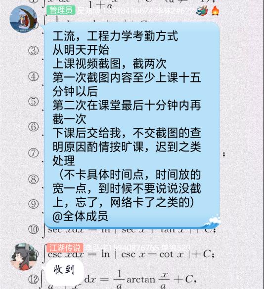随后,班长董云戈在会议上就目前的网络教学情况发表了看法。他说,从2月10日开始的线上教学,已进行了两周时间,总体上同学们对于网上教学的参与度十分积极,第一周的课堂质量并不高,问题主要出在了雨课堂的卡顿,延迟上,考勤也难以统计,但同学们也在积极和老师沟通,想方设法克服现有困难。第二周随着上课方式的多元化,老师们纷纷采用腾讯会议,群直播,腾讯课堂等方式,上课卡顿的问题得到了很大程度的缓解,但仍有极个别同学没能调整好状态,出现迟到等问题。对于这一点,班长与学委从上周开始就要求大家截图考勤(图二),希望每个同学重视课堂,调整状态。