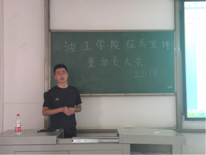 征兵宣讲暨动员大会在武教B-210进行,学工办梁军老师、史永波老师以及征兵工作宣讲员吴文杰同学、夏铭洋同学到场参加会议。