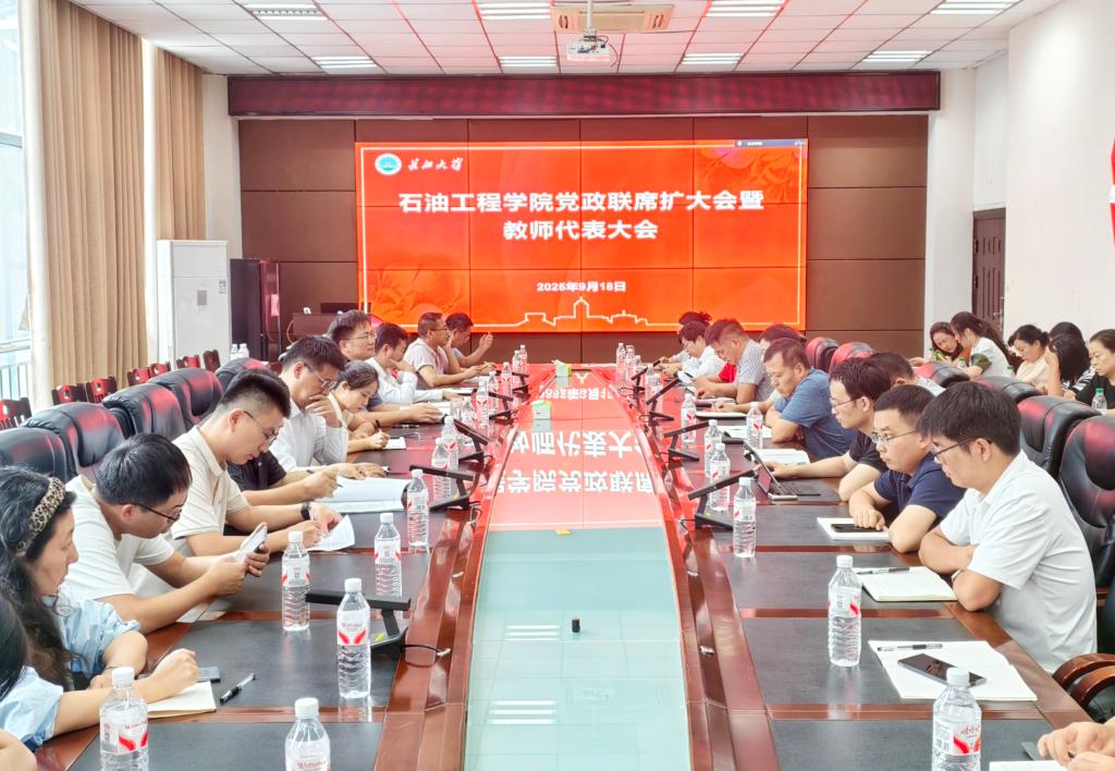 在石油科技大楼B113召开党政联席(扩大)会暨教师代表大会。会议由院长宇波主持,学院党政领导班子、教工党支部书记、系正副主任、院科学中心主任及所长、院教学中心主任及团队负责人、实验中心正副主任、院行政各科室负责人与教师代表参会。