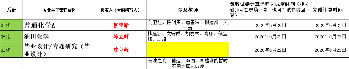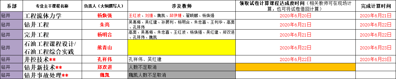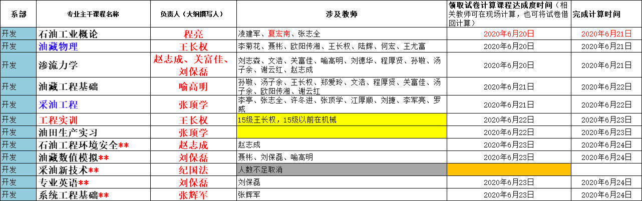 根据2020年6月16日专业认证推进会会议决定,无码a片 石油工程专业19门课程的达成度计算由相关课程任课教师负责,各系主任(钻井系熊青山教授、开发系张顶学教授、油化系付美龙教授)负责落实安排具体完成教师,完成达成度计算的截止时间为6月24日。相关课程、课程大纲撰写人、授课教师名单、领取试卷时间安排等见附件。