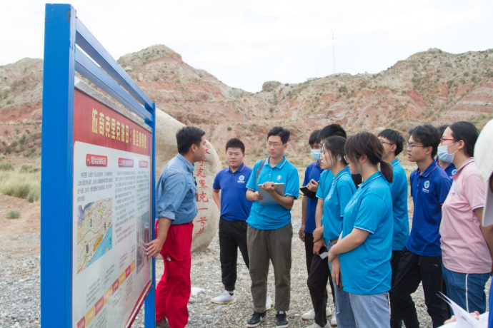 图为工程师秦骁向实践队员讲解依奇克里克1号井历史。通讯员 陈金建 摄
