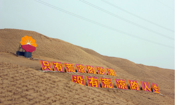 图为沙漠中石油人的标语“只有荒凉的沙漠,没有荒凉的人生”。通讯员 陈金建 摄
