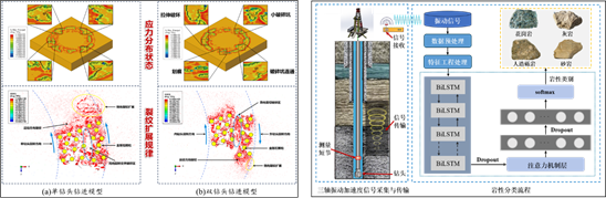 基于Voronoi划分法构建了多晶粒、含边界以及各向异性的岩石模型,并插入Cohesive单元,形成钻进过程岩石动态裂纹扩展可视化模型,探究钻井工程参数与岩石物性的交互响应机制,建立基于工程参数的随钻岩石特性识别算法,形成多源信息协同验证的高精度随钻地层岩石特性智能识别技术。